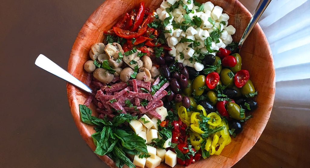 Colorful antipasto salad in a wooden bowl with cheeses, olives, salami, peppers, mushrooms, tomatoes, and herbs.