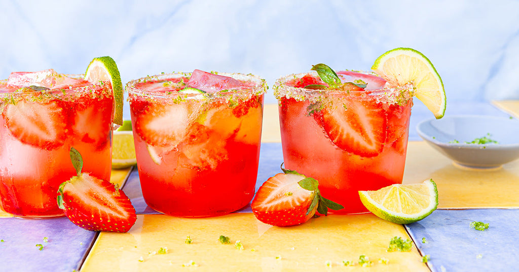 Three colorful cocktails with strawberries and lime slices sit on a bright, patterned table, garnished with mint leaves and a sugared rim, alongside fresh fruit and a small bowl of lime zest.