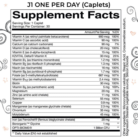 • Complete Nutrient Profile: J1 caplets contain key vitamins and minerals in bioavailable forms, including Vitamin A, C, D, E, K2, B-complex, Magnesium, Zinc, Selenium, and more.