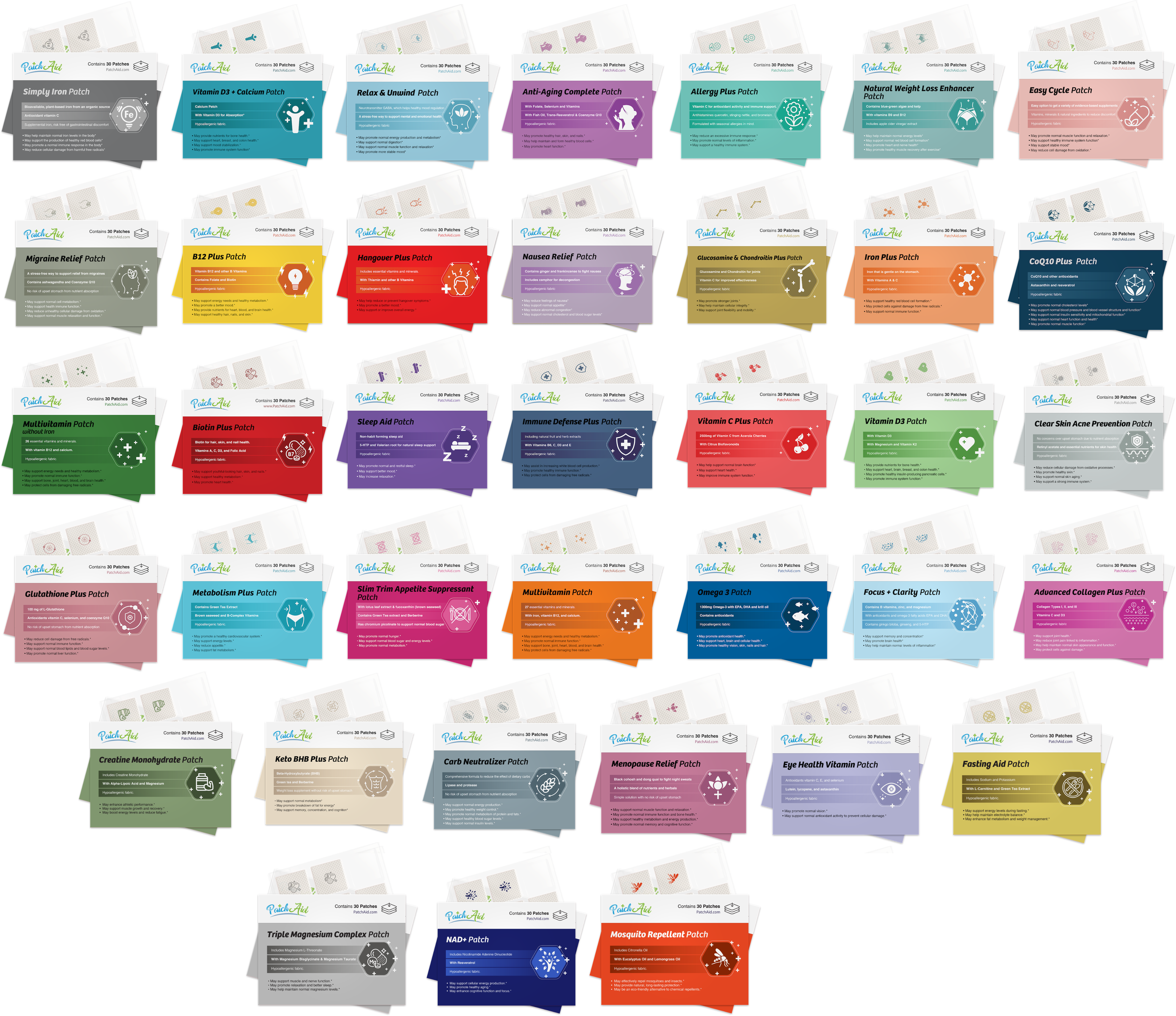 At PatchAid, we support total health. We see the human body as the complex, interactive system that it is, with ever-changing components that affect each other. You can see this holistic philosophy reflected in our patches when you see that PatchAid patches contain more nutrients per patch than other brands.