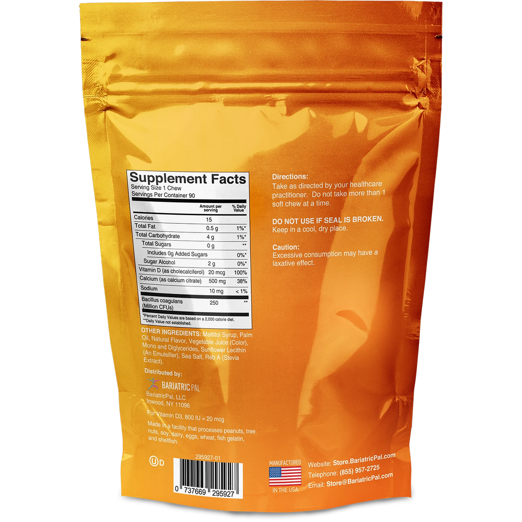 With BariatricPal Calcium Citrate Soft  Chews with Probiotics, you can love your calcium supplements as much as your bones do! They come in bags of 90 chews.