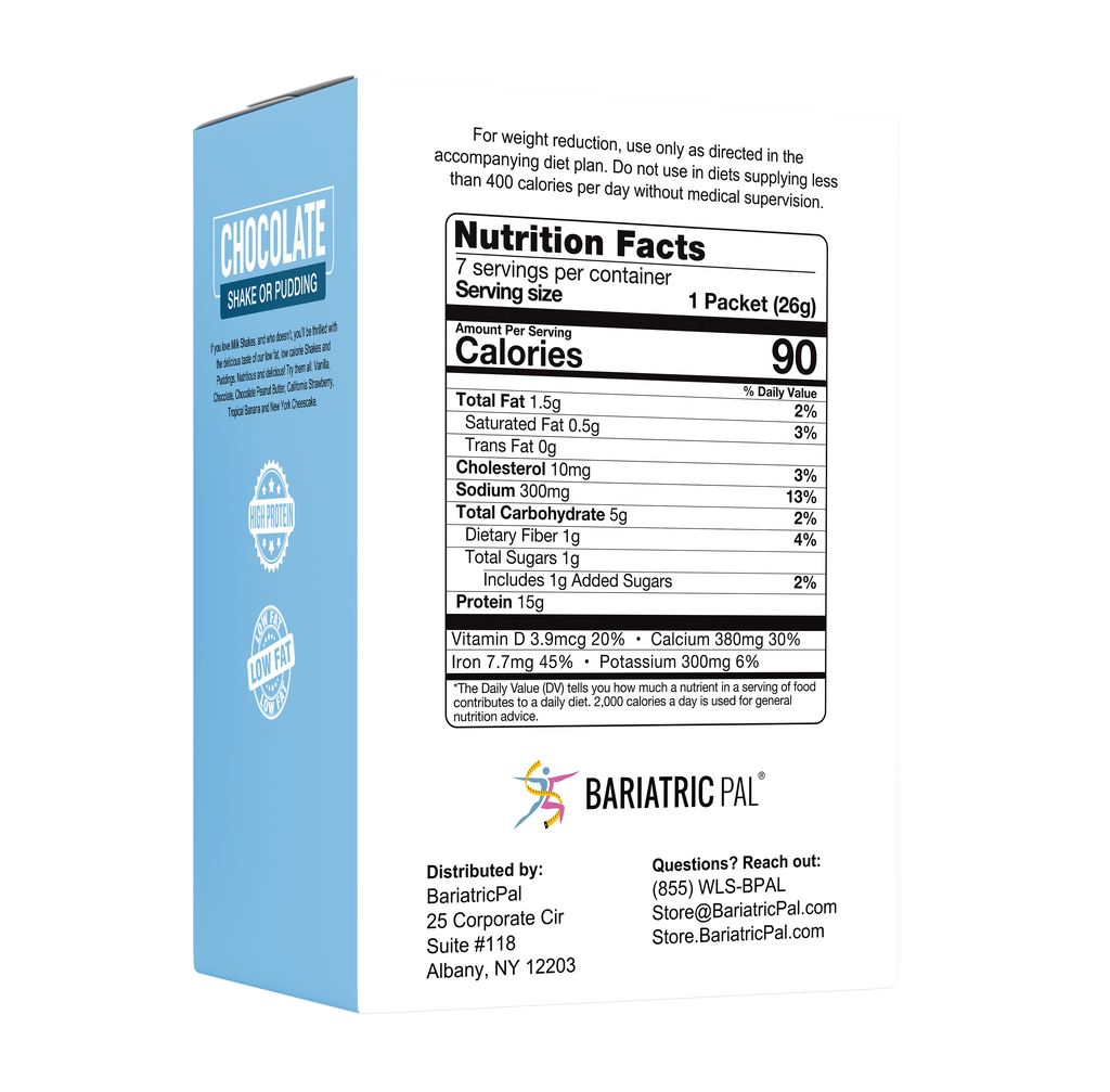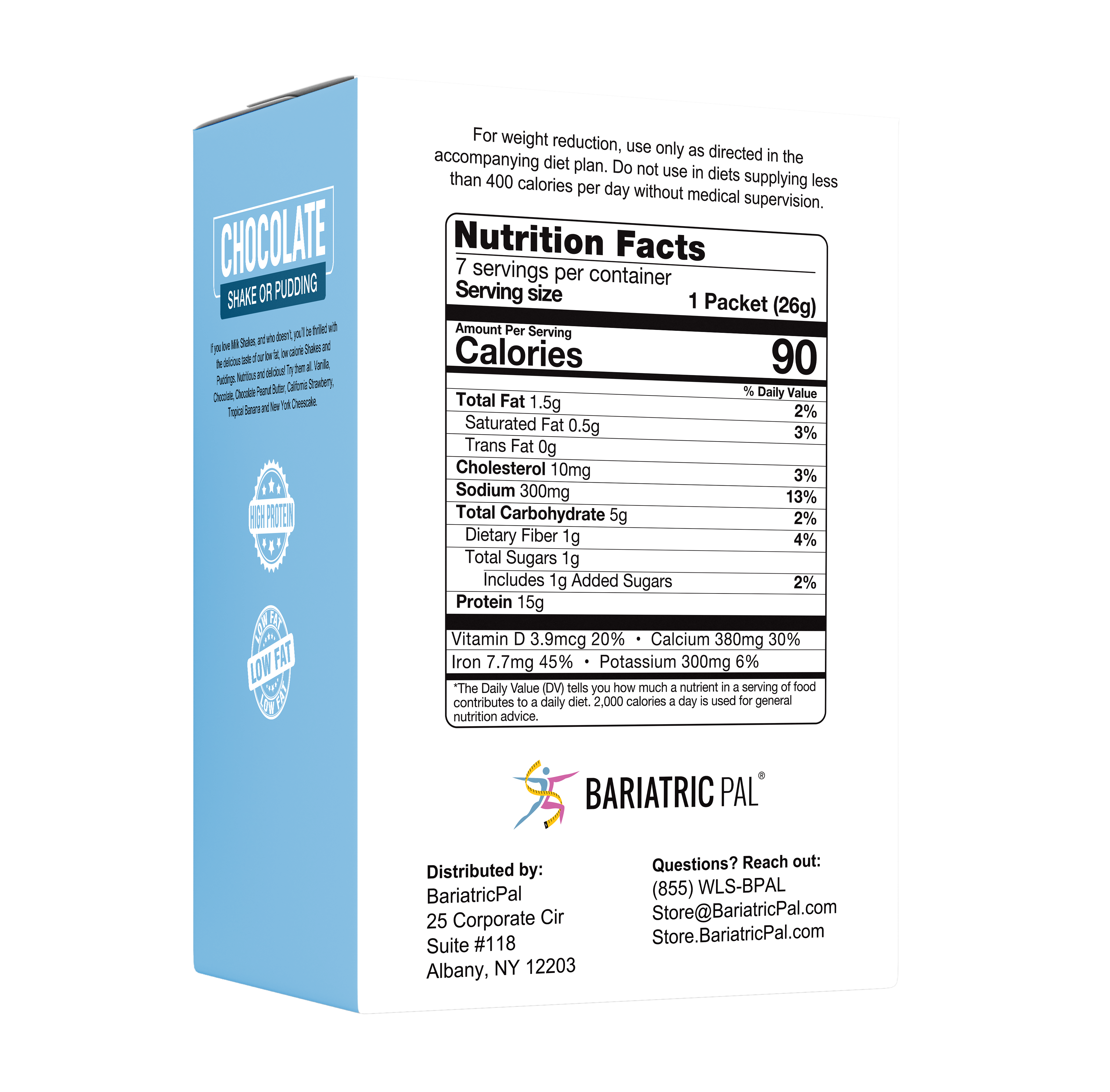 Whether you want a spoonable chocolate pudding or a thick chocolate shake, you can satisfy your chocolate craving with BariatricPal Protein Shake or Pudding – Chocolate. The box includes 7 packets of instant delight and nutrition.