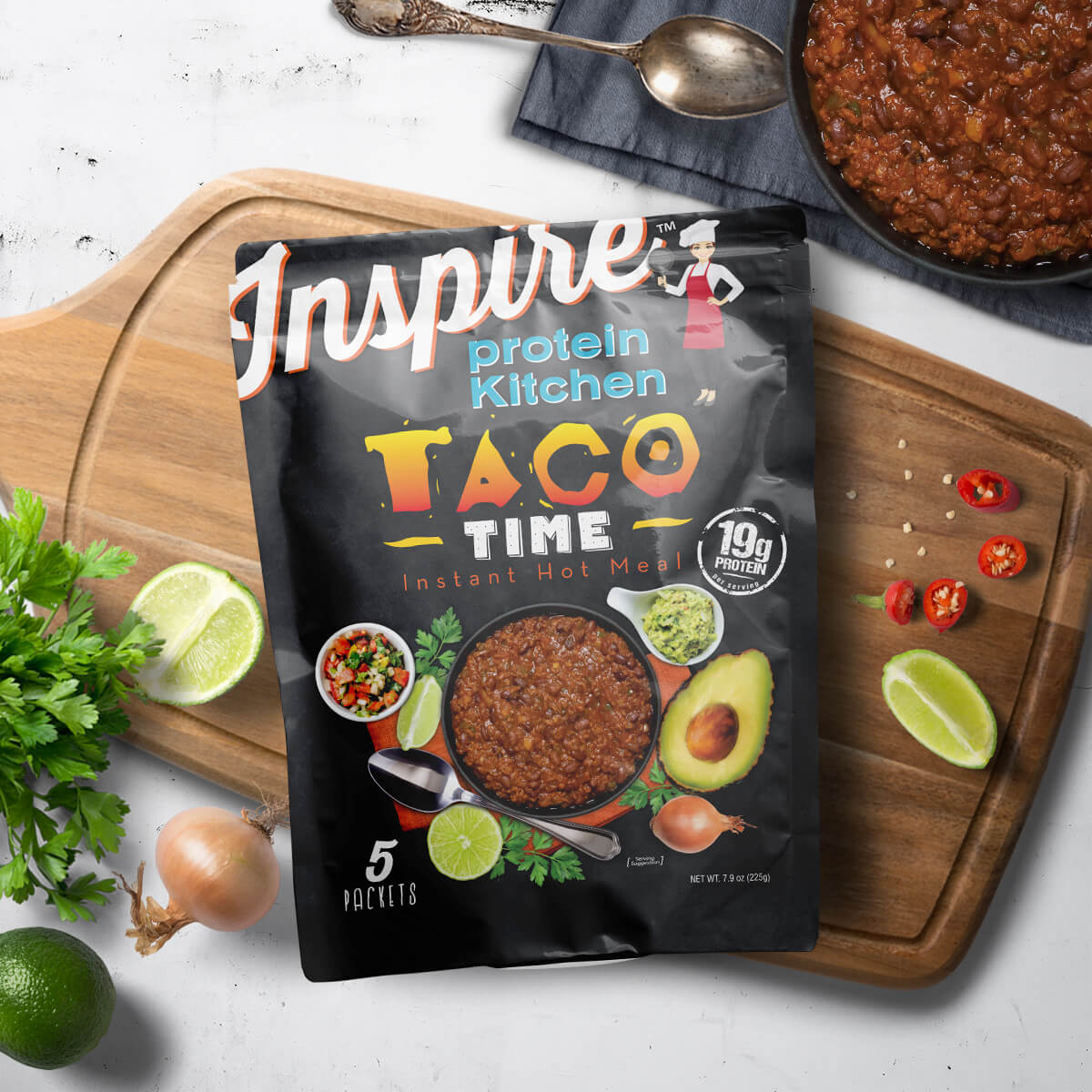 Five single serve packets, just add water & microwave, or steep with boiling water for delicious taco filling with 19 grams of protein. Ready to eat from your mug in minutes. A hot meal at home or work that's light and satisfying. Inspire Taco Filling is a delicious & a nutritious addition to your Bariatric lifestyle.