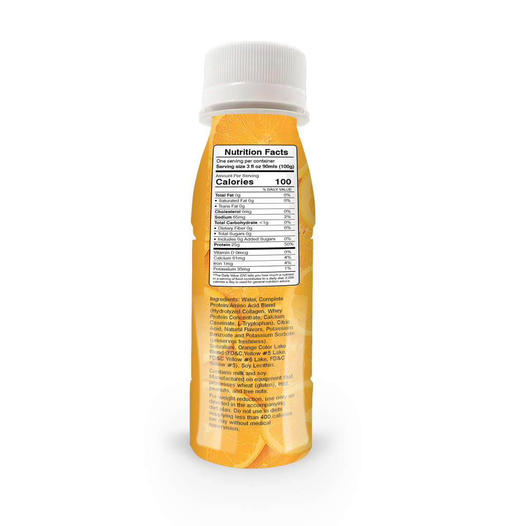 Ingredients: Water, Complete Protein/Amino Acid Blend (Hydrolyzed Collagen, Whey Protein Concentrate, Calcium Caseinate, L-Tryptophan), Citric Acid, Natural Flavors, Potassium Benzoate and Potassium Sorbate (preserves freshness), Sucralose, Orange Color Lake Blend (FD&C Yellow #5 Lake, FD&C Yellow #6 Lake, FD&C yellow #5), Soy Lecithin