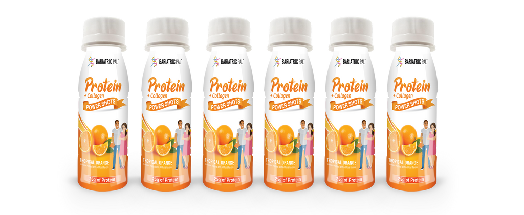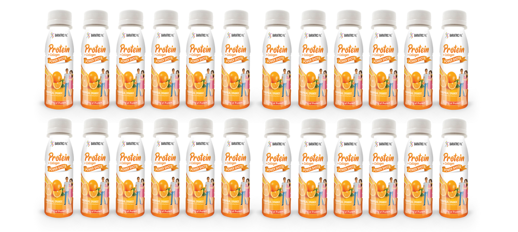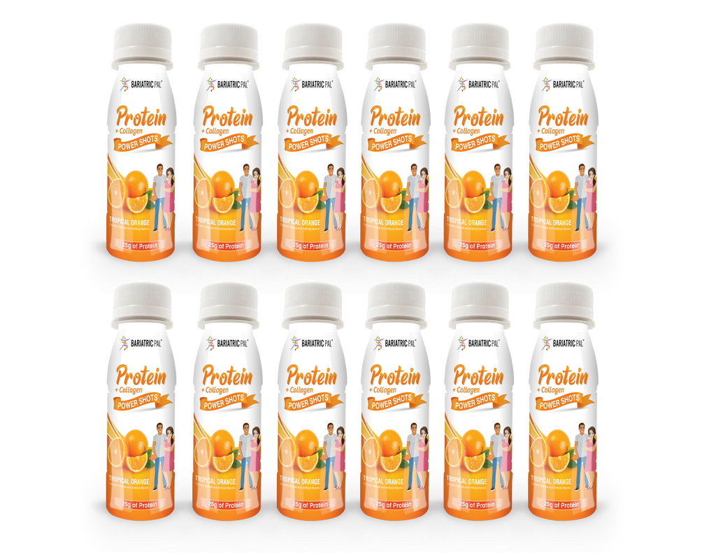 Introducing BariatricPal 25g Whey & Collagen Complete Protein Power Shots in Tropical Orange flavor – a powerful upgrade to our popular 15g shots, designed to provide an even higher level of complete protein in the same convenient 3.0 oz size. Perfect for those with active lifestyles, post-bariatric surgery needs, or anyone seeking a substantial protein boost without the bulk of a full shake.