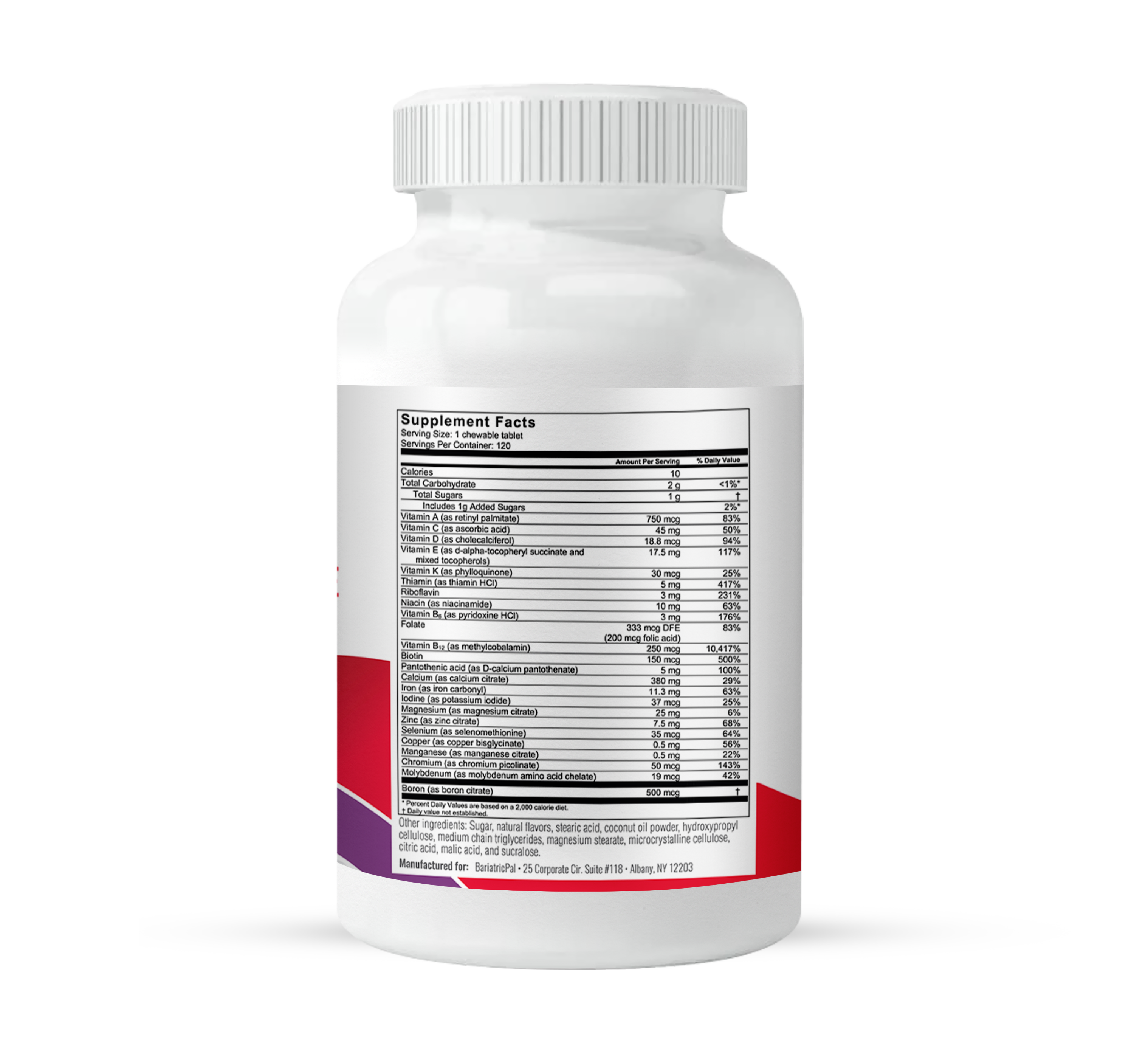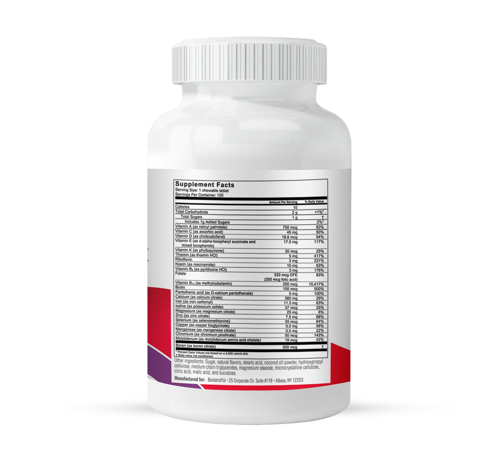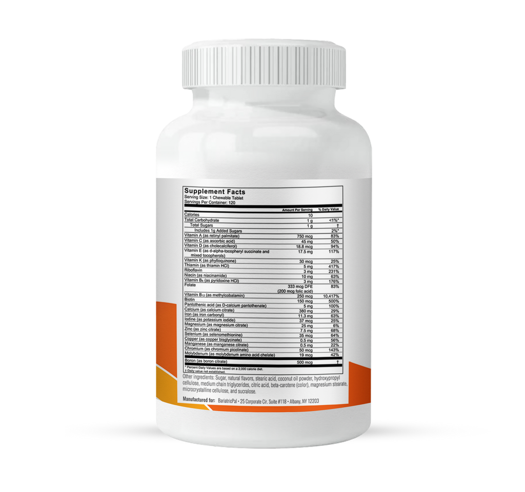 BariatricPal Multivitamin ALL-IN-ONE Chewables are based on the latest post-op guidelines from the American Society for Metabolic and Bariatric Surgery (ASMBS) to provide more than 20 essential vitamins and minerals. BariatricPal Multivitamin ALL-IN-ONE is especially high in nutrients such as calcium, iron, vitamins B12 and D, folic acid, and biotin, which are known to be at risk for bariatric surgery patients.