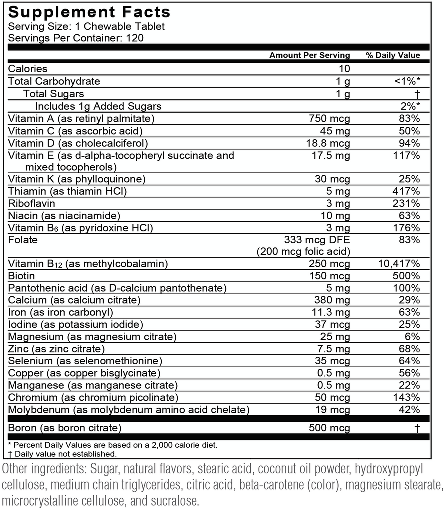 That’s not all. It has high amounts of vitamins and minerals that are at high risk for bariatric patients, including vitamin B12, thiamin (vitamin B1), biotin, and zinc. This complete chewable also includes vitamins C, E, and A, other B vitamins, and iodine, manganese, copper, and chromium.