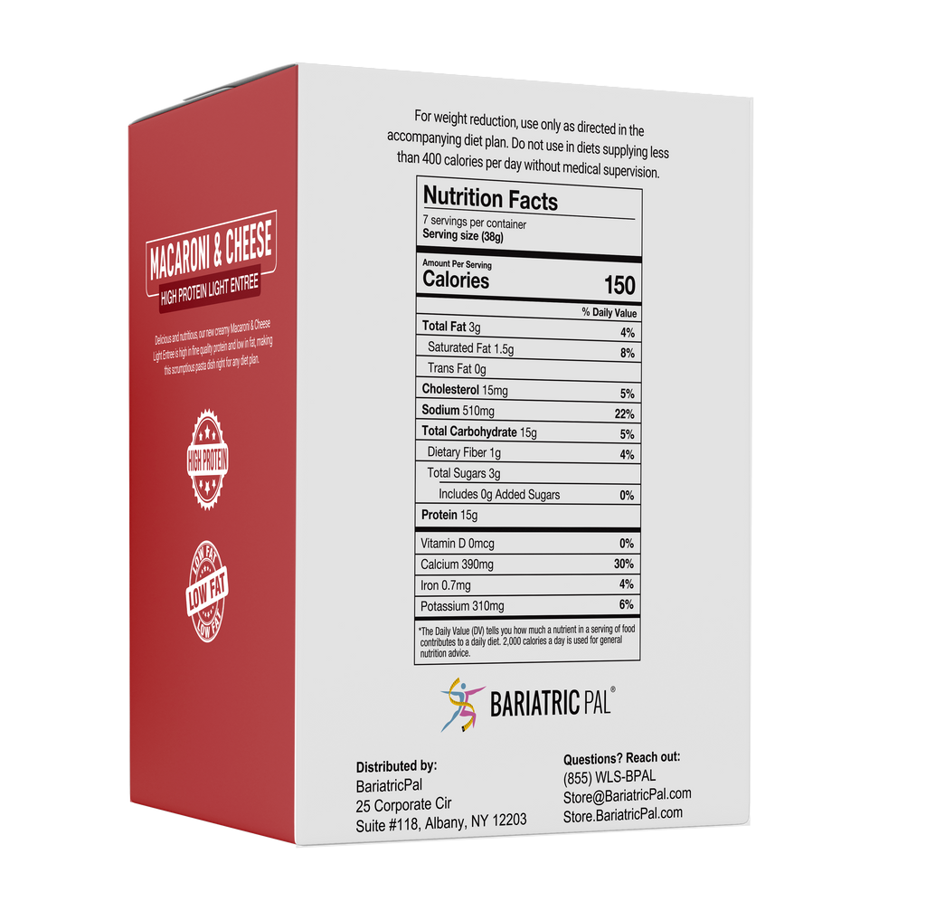 Low-cal and high-protein: just what the doctor ordered to keep you losing weight after weight loss surgery. That’s exactly what BariatricPal Protein Entrée – Creamy Macaroni & Cheese delivers. It is conveniently packaged in single-serving packets so there is no temptation to eat too much, and what could be easier than mixing it with hot water to have a meal ready in minutes?