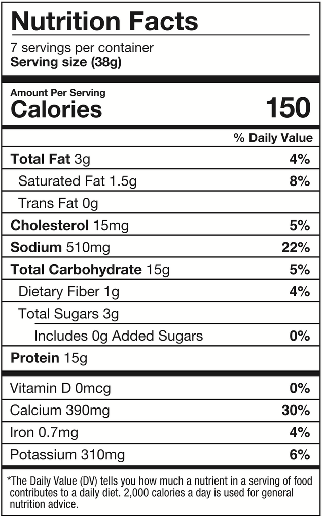 Ingredients: Pasta [Durum Flour (Wheat), Niacin, Ferrous Sulfate (Iron), Thiamin Mononitrate, Riboflavin and Folic Acid], Calcium Caseinate, Parmesan and Cheddar Cheeses [(Cultured Pasteurized Milk and Part-Skim Milk, Salt, Enzymes, Cheese Cultures), Whey, Buttermilk Solids, Salt, Disodium Phosphate, Lactic Acid], Milk Protein Isolate, Modified Corn Starch, Natural Cheese Flavor, Gum Blend (Acacia, Guar, Xanthan), Garlic Powder, Potassium Citrate, Citric Acid, Salt, Annatto Powder (for color), Turmeric Powder (For color), Soy Lecithin, Sunflower Lecithin.