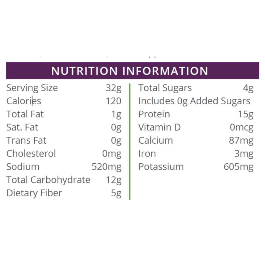Ingredients: Textured Vegetable Protein (Soy Flour, Caramel Color), Soy Protein Isolate, Coconut Curry Seasoning (Spice, Corn Maltodextrin, Salt, Yeast Extract, Sugar, Potato Maltodextrin, Onion Powder, Turmeric, Garlic Powder, Coconut Oil, Acacia Gum, Citric Acid, Silicon Dioxide, Natural Flavor, Polysorbate 80, Turmeric Extractives (for color), Caramel Color), Dehydrated Onion, Dehydrated Tomato, Dehydrated Green Chili Pepper, Salt, Dehydrated Cilantro Flakes, Xanthan Gum, Turmeric, Curry Powder blend (Spice, Turmeric, Paprika, Silicon Dioxide), Garlic Powder, Onion Powder, Black Pepper.