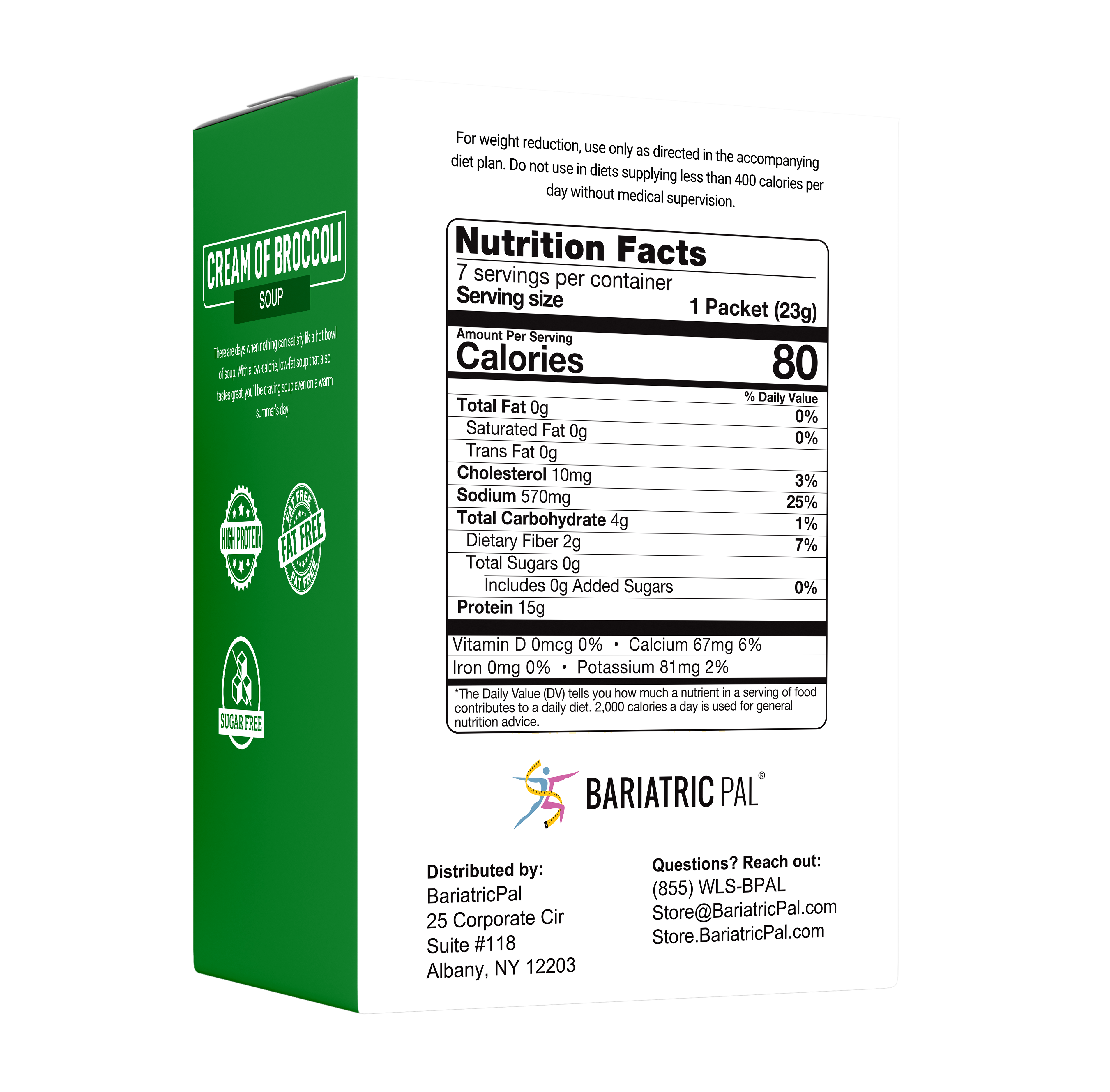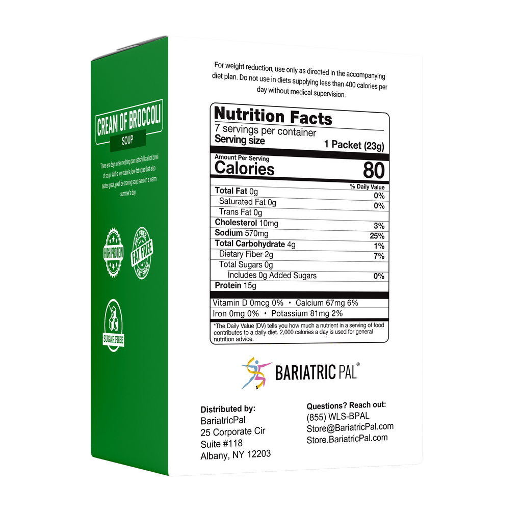 BariatricPal Protein Soup is your mealtime solution. Just add water and enjoy your instant high-protein soup. BariatricPal Protein Soup – Cream of Broccoli is a creamy comfort food without the extra fat and calories. Each bowl has only 80 calories and no fat! Made from real broccoli, it has 15 grams of protein. It can make you feel better pre-op and post-op while giving you the protein you need. 7 packets per box.