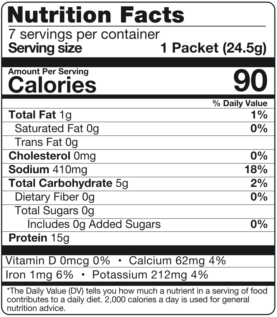 Ingredients: Hydrolyzed Gelatin, Soy Protein, Ultra Sperse Starch, Non-Dairy Creamer, Salt, Yeast Extract, Mushroom Bits, Natural and Artificial Flavor, HVP, Potassium Chloride, Onion Powder, Tricalcium Phosphate, I&G, White Pepper, Soy Lecithin.