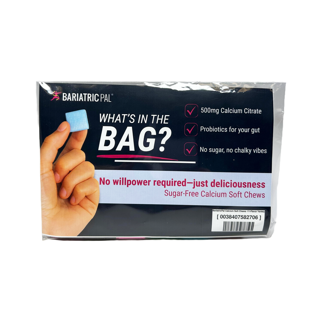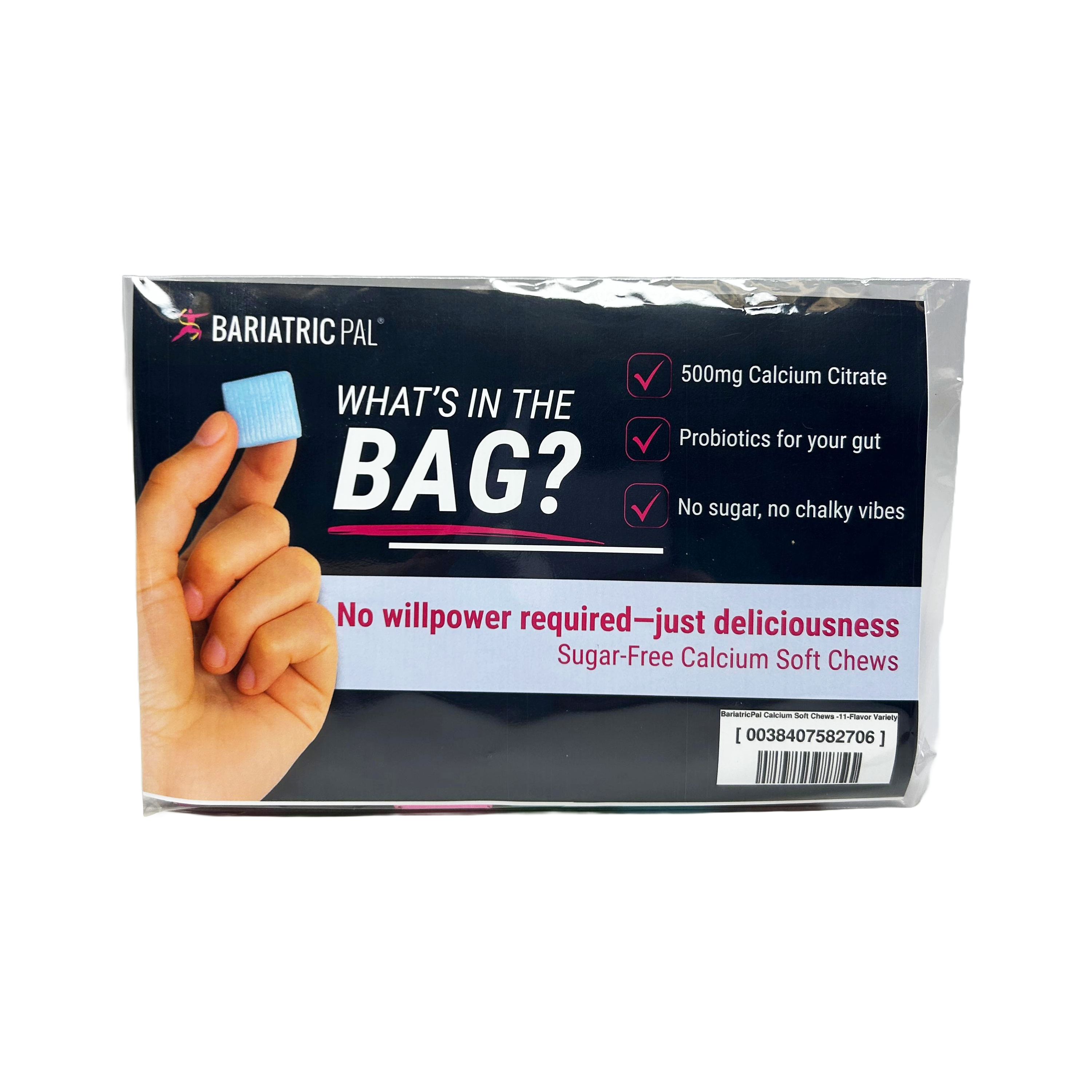 Introducing the new 11-Flavor Sample Pack of BariatricPal Sugar-Free Calcium Citrate Soft Chews, each chew providing 500 mg of calcium citrate with probiotics.