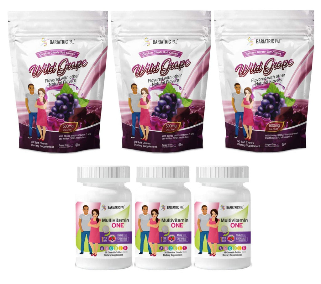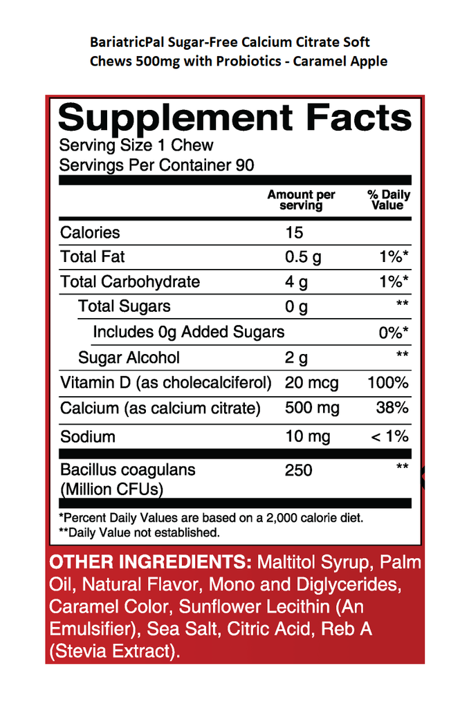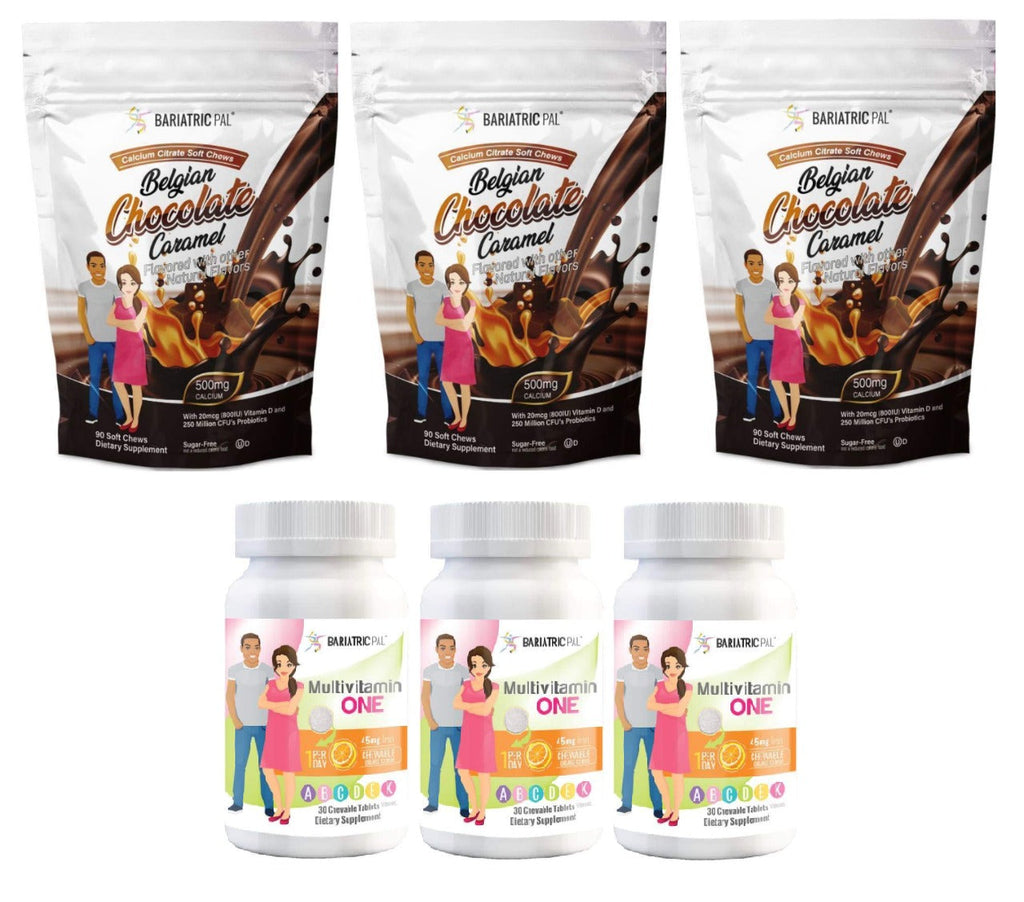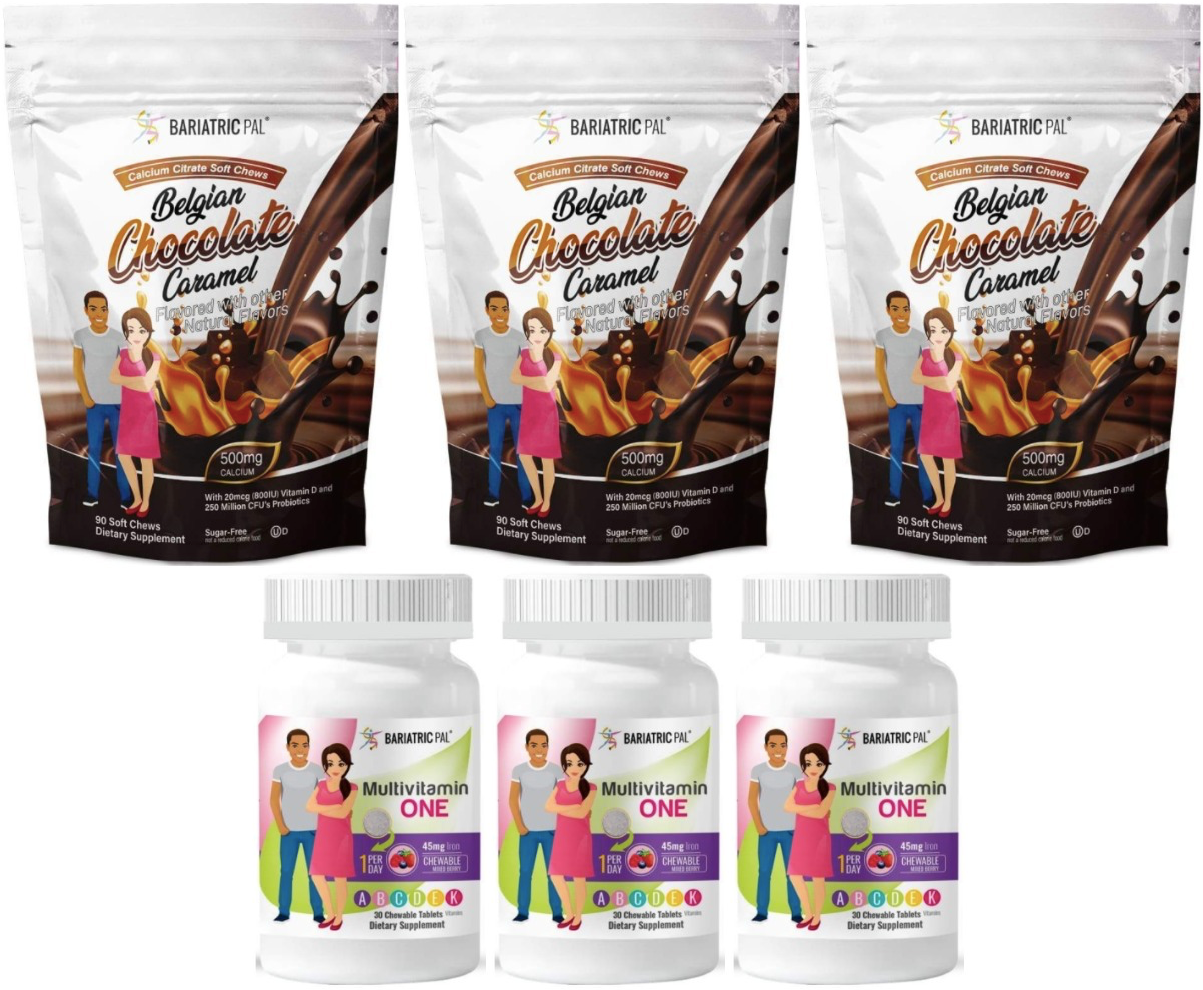 - A choice of BariatricPal Calcium French Vanilla Caramel Probiotic Soft Chews or BariatricPal Calcium Citrate Soft Chews with Probiotics - Strawberry Watermelon Twist or BariatricPal Sugar-Free Calcium Citrate Soft Chews with Probiotics - Belgian Chocolate Caramel or BariatricPal Sugar-Free Calcium Citrate Soft Chews with Probiotics - Wild Grape or BariatricPal Multivitamin ONE "1 per Day!" Bariatric Multivitamin Chewable & IRON-FREE - Orange Citrus or BariatricPal Sugar-Free Calcium Citrate Soft Chews 500mg with Probiotics - Caramel Apple or BariatricPal Sugar-Free Calcium Citrate Soft Chews 500mg with Probiotics - Orange Creamsicle or BariatricPal Sugar-Free Calcium Citrate Soft Chews 500mg with Probiotics - Piña Colada or BariatricPal Sugar-Free Calcium Citrate Soft Chews 500mg with Probiotics - Chocolate Mint or BariatricPal Sugar-Free Calcium Citrate Soft Chews 500mg with Probiotics - Blue Raspberry (NEW!)