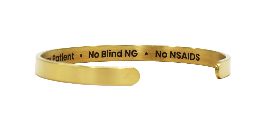The outside of the cuff features the universally recognized medical caduceus symbol, instantly alerting healthcare professionals to your specific medical needs. The bracelet is clearly stamped on the inside with "Gastric Surgery Patient • No Blind NG • No NSAIDS," effectively communicating crucial medical directives to prevent potential complications.