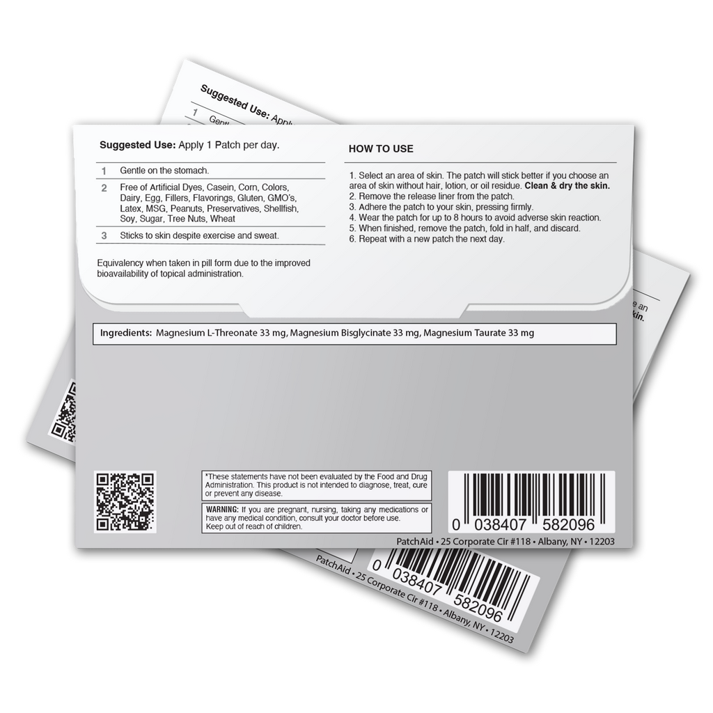 4. For best results, PatchAid patches should be worn for 8 hours. Wearing the Triple Magnesium Complex patch for longer than 8 hours provides no additional benefit.